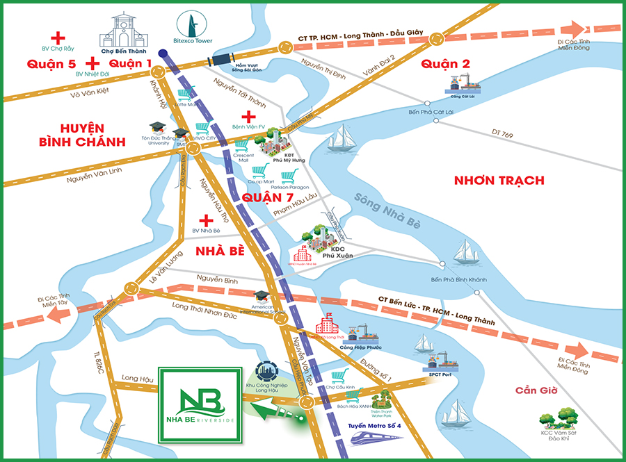 Dự án Nhà Bè Riverside nằm ngay khu vực cửa ngõ tiến vào khu Nam Sài Gòn. Từ dự án, cư dân nhanh chóng kết nối với trung tâm TP.HCM qua đường Nguyễn Văn Tạo thông ra đường Nguyễn Hữu Thọ với 6 làn xe.